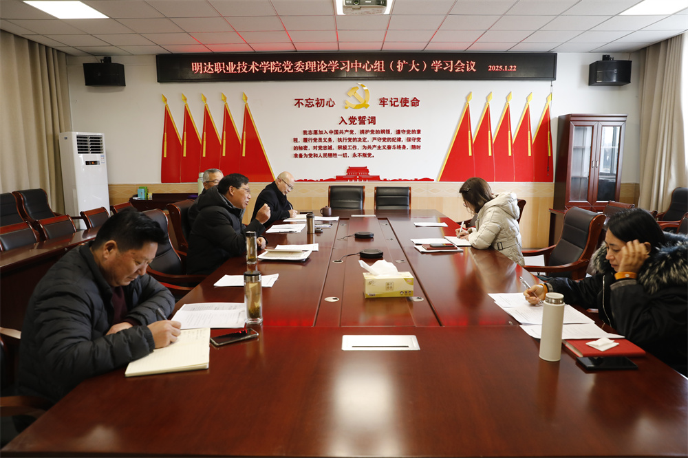 2025 年 1 月22 日上午,明达职业技术学院党委理论学习中心组(扩大)学习会议在行政楼二楼会议室召开,学校党委成员及校级领导出席会议,党委书记刘必千主持会议。会议围绕民主生活会开展学习,并布置安排相关工作。会议学习了习近平总书记在二十届中央纪委四次全会上的重要讲话精神、习近平总书记在中共中央政治局召开民主生活会上的重要讲话精神;传达了盐城市纪委机关、市委组织部《关于开好2024年度县以上党和国家机关党员领导干部民主生活会的通知》精神;审议了中共明达职业技术学院委员会《关于召开2024年度党员领导干部民主生活会的工作方案》。